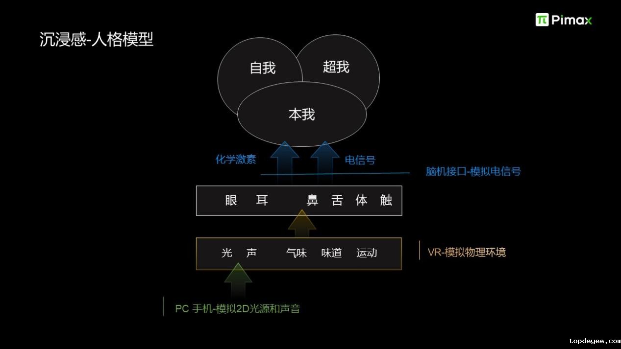 VR技术通过模拟物理环境——光、声音、气味、味道、运动,并以模拟出的物理环境来影响我们的眼、耳、鼻、舌、体感、触觉,由此产生化学激素和电信号来影响到本我,继而影响到自我和超我。这也就是VR让人们产生“身临其境感”的心理基础。