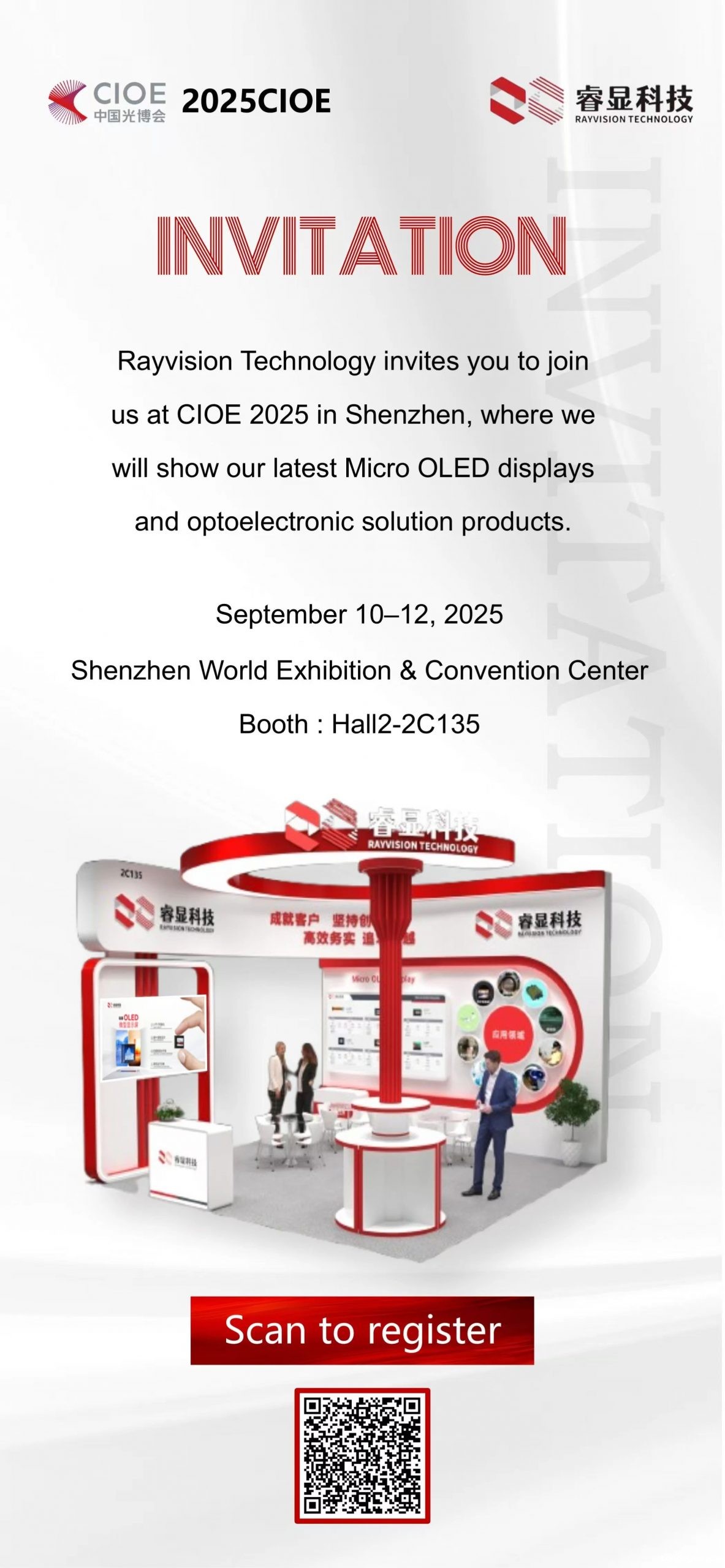 From September 10th to 12th, at booth 2C135, Hall 2, Shenzhen International Convention and Exhibition Center, Rayvision Technology looks forward to meeting you face to face, using Micro OLED technology to illuminate new possibilities for XR vision and jointly explore new opportunities in the optoelectronics industry!